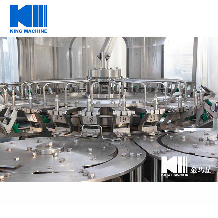 本灌裝生產(chǎn)線專用于3-5加侖桶裝水的灌裝,型號包括了QGF-100,QGF-240,QGF-300,QGF-450,QGF-600,QGF-900,QGF-1200。合消毒、沖洗、灌裝、壓蓋四為一體。沖洗機(jī)采用了多種洗液以及消毒液對瓶子進(jìn)行清洗以及消毒,消毒液能夠循環(huán)使用。瓶蓋會在清洗和消毒后運至旋蓋機(jī)自動進(jìn)行旋蓋。本產(chǎn)品功能齊全,涵蓋了清洗、消毒、灌裝、旋蓋、計數(shù)等功能,高度自動化,實為飲料生產(chǎn)廠家理想的優(yōu)選設(shè)備。